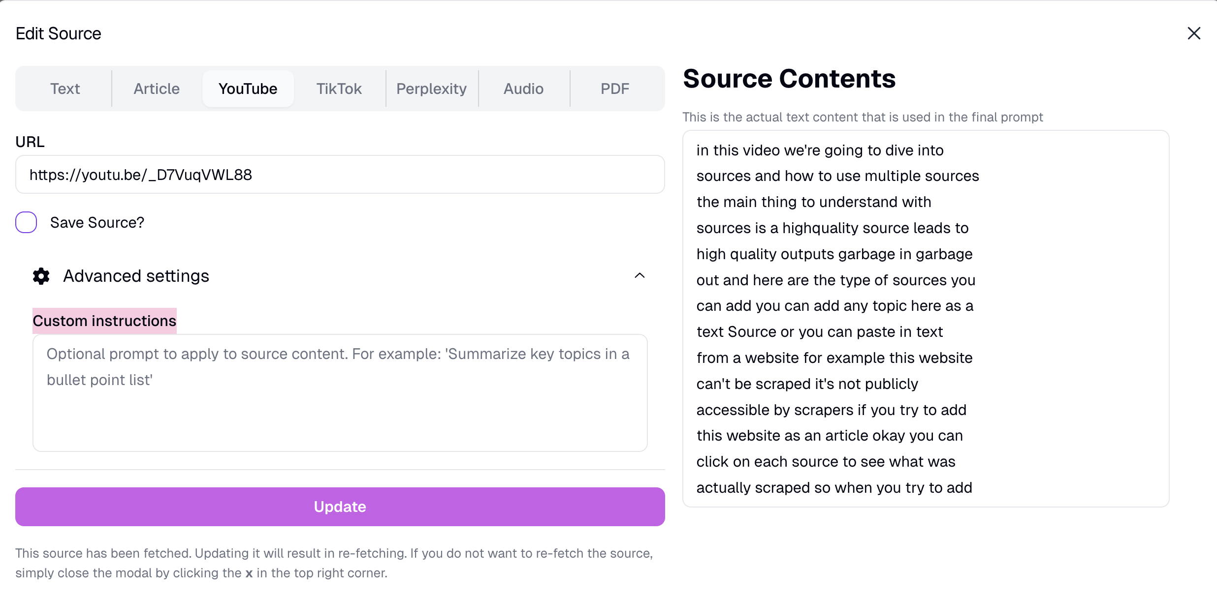 "Custom Instructions" allow you to apply a prompt to each source before generating your final content.